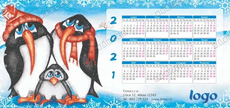 Vánoční přání s kalendářem a třemi zmrzlými tučňáky