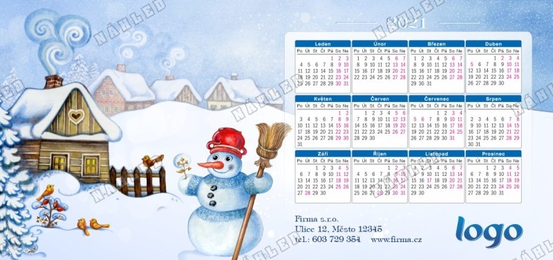 Novoročenka s kalendářem a sněhulákem v zasněžené vesničce