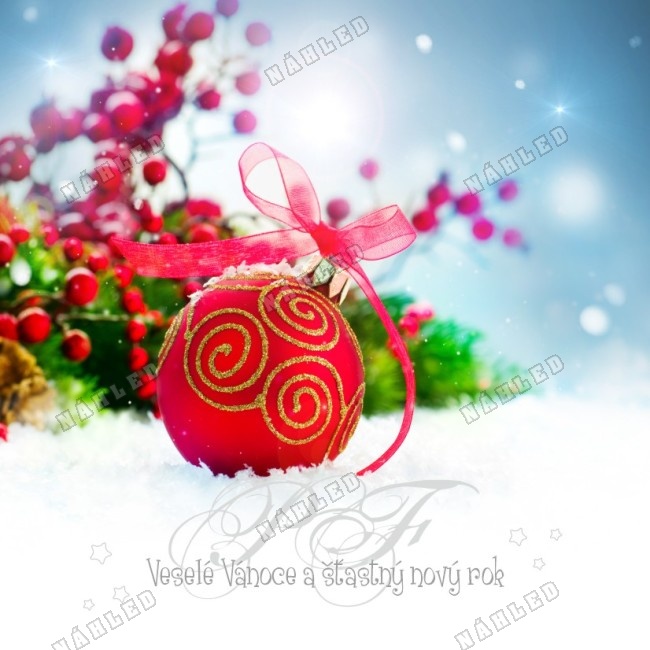Vánoční přání s větvičkou a červenou koulí s mašlí ve sněhu