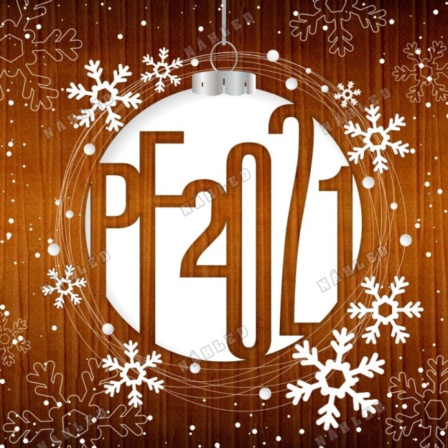 Hnědé vánoční přání s bílou ozdobou a sněhovými vločkami