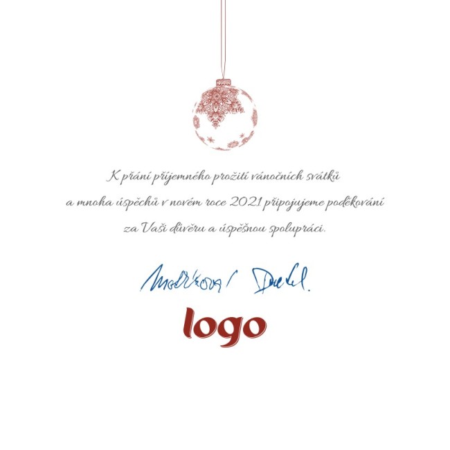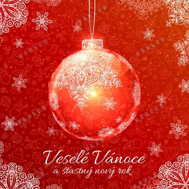 Červené vánoční přání poseté sněhovými vločkami a s červenou vánoční koulí