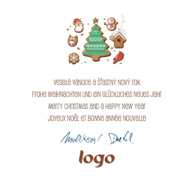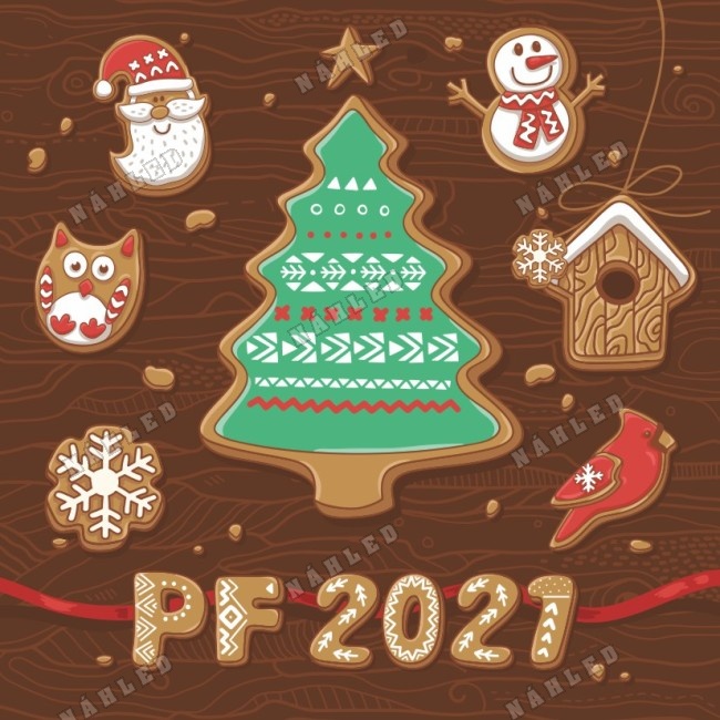 Novoroční přání s vánočním stromkem obklopeným sněhulákem, ptáčkem, budkou, vločkou a Santou
