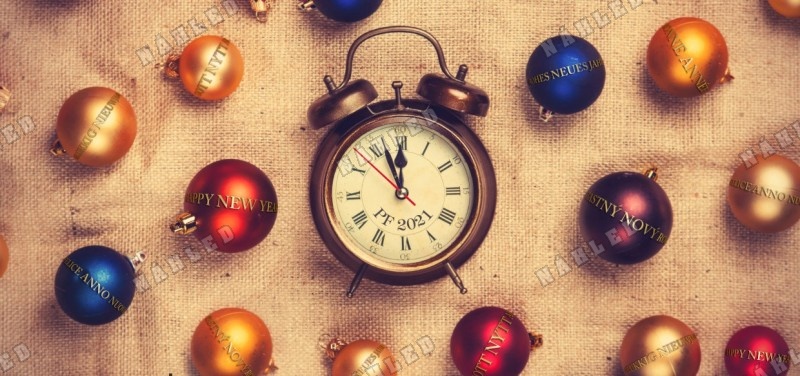 Vánoční přání s budíkem a vánočními ozdobami