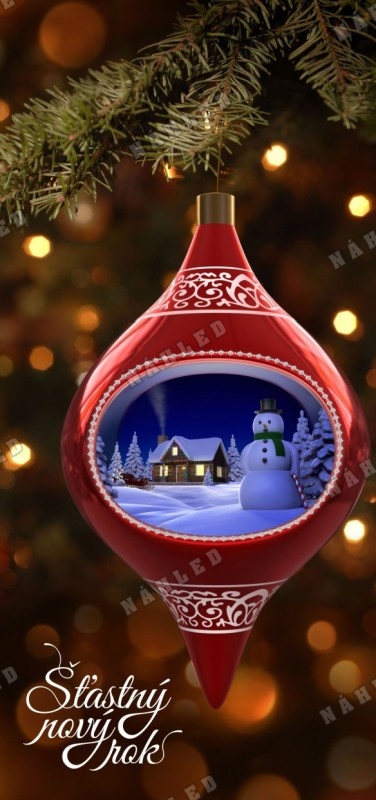 Vánoční přání se zavěšenou vánoční ozdobou s obrázkem sněhuláka a zasněžené chalupy