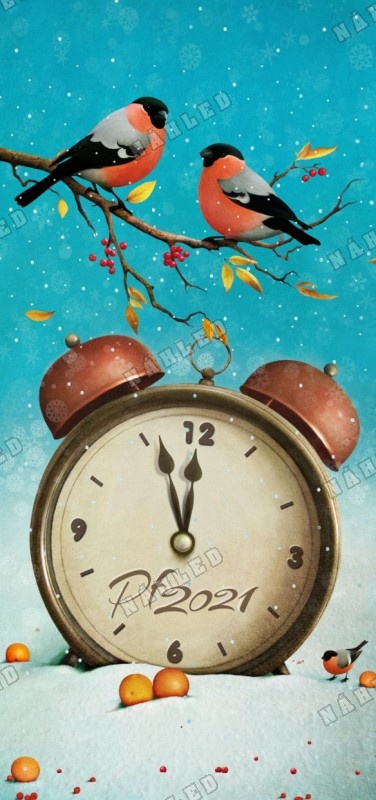Novoročenka s budíkem a sýkorkami očekávající příchod Nového roku na větvi