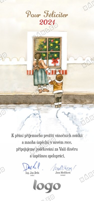 Vánoční přání s dětmi vyhlížejícími v okně Ježíška