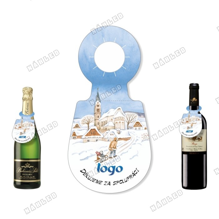 Visačka na lahev s vesnicí v zimní krajině a postavou táhnoucí sáně s dětmi po cestě